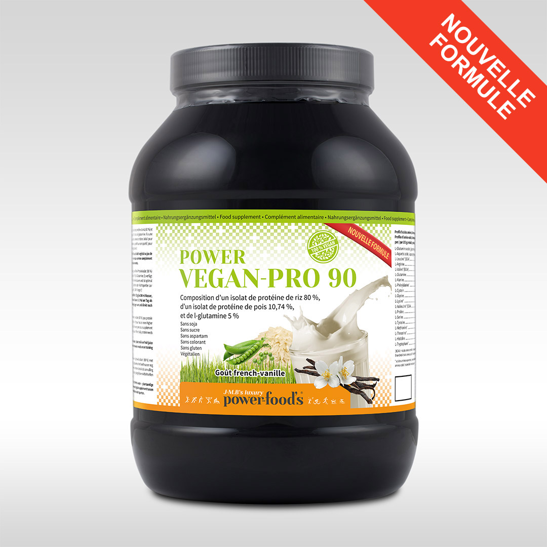 Power Vegan-Pro 90 est notre nouvelle formule de Power-Food’s J-M.B® qui se compose désormais de 80 % d’isolat de protéines de riz et de 10,76 % d’isolat de protéines de pois, avec l’ajout de 5 % de L-Glutamine. Cela permet d’augmenter à la fois la quantité et la qualité de la protéine dans notre Power Vegan-Pro 90. Il s’agit d’un mélange de protéines purement végétales avec une teneur très élevée en protéines et en acides aminés.